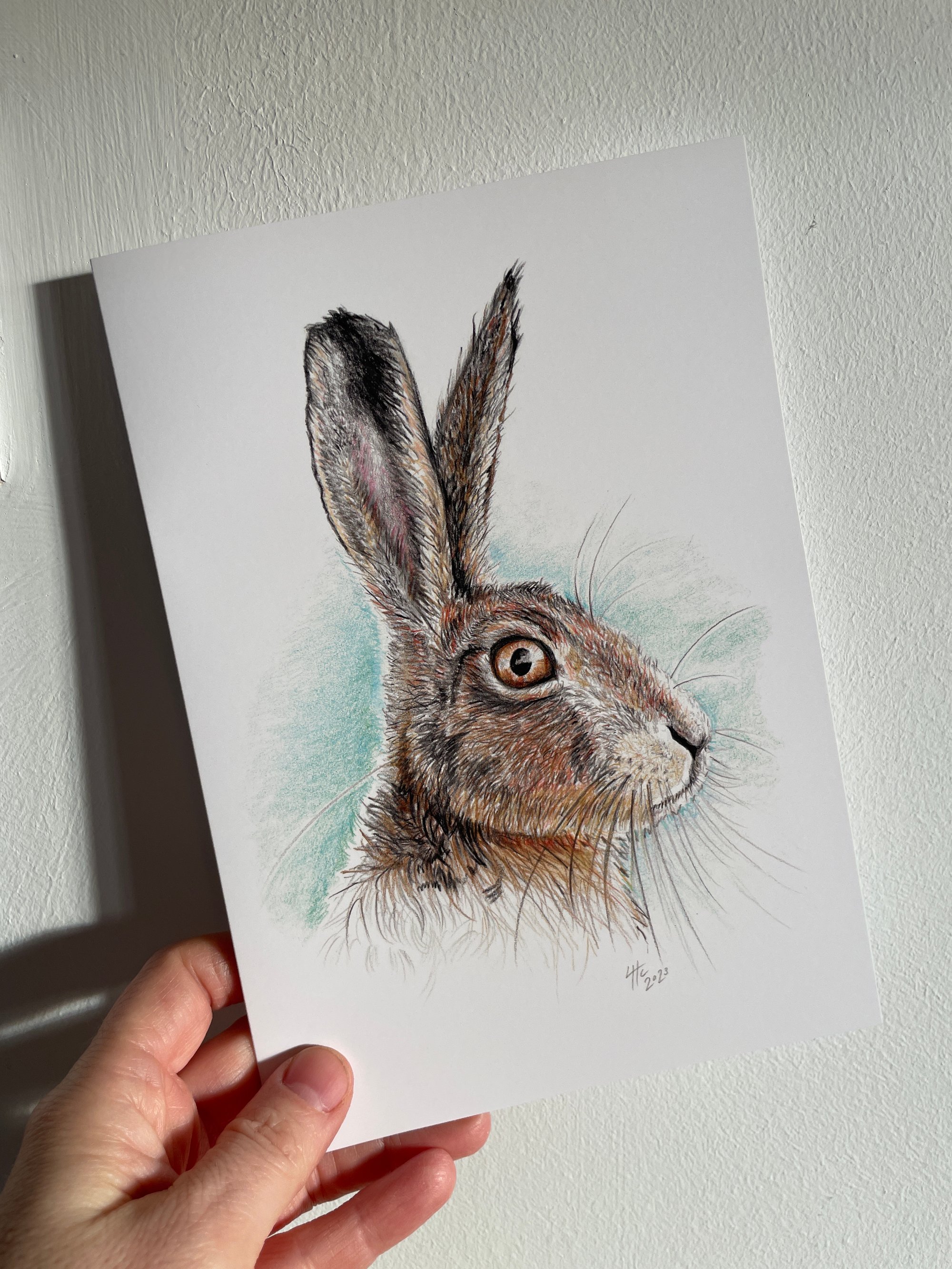 A5 Greetings card with envelope, featuring an image of my original colour pencil drawing of a hare. Printed locally to me. Blank inside for your own message.